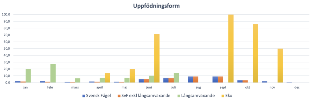 Små- eller storskalig produktion är inte avgörande utan en låg förekomst av campylobacter är i huvudsak beroende av standard på kycklingarnas stallar och de biosäkerhetsåtgärder som gäller för medlemmar inom Svensk Fågel. För kyckling med tillgång till utevistelse är nivåerna campylobacter högre (56,3 procent under 2025 för kycklingflockar som inte är anslutna till Svensk Fågel).