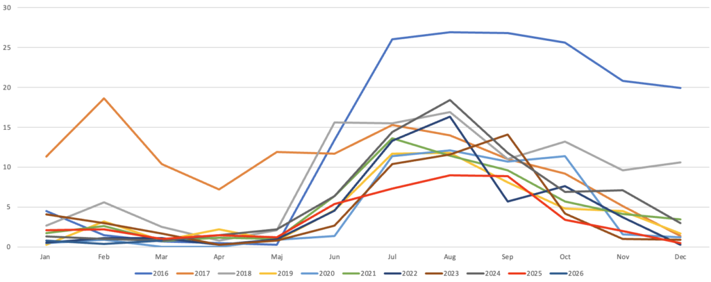 De åtgärder som vidtagits genom åren har sänkt antalet positiva flockar från cirka 60 procent år 1989 till 3,8 procent 2025, utslaget över året.